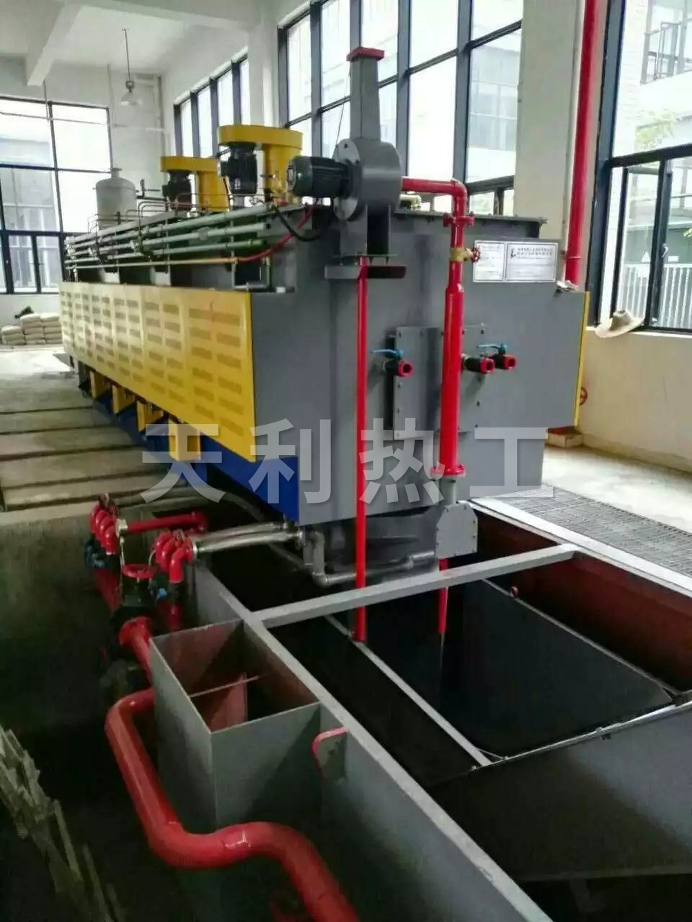 淬火池是淬火的場所,就是一個池子,里面有水溶液或者是油,就是箱式爐出來的工件淬火的冷卻的地方,一般就是直接丟進去,然后等一段時間撈出來。還有其他的一些設備,比如高頻機,就是一個可以將 50 赫茲的工頻電變成一個200K 赫茲電流的超大功率的設備,比如常見的有 200 千瓦的***大功率,然后用一個內部通冷卻水的銅管做的線圈放在工件的外面,一般幾十毫米的工件,幾秒種到十幾秒的時候你就看到工 件表面變紅,表面溫度到預定值的時候,然后有一個水套升上來噴淬火液到工件 表面,完成淬火過程。常見的就這些了。